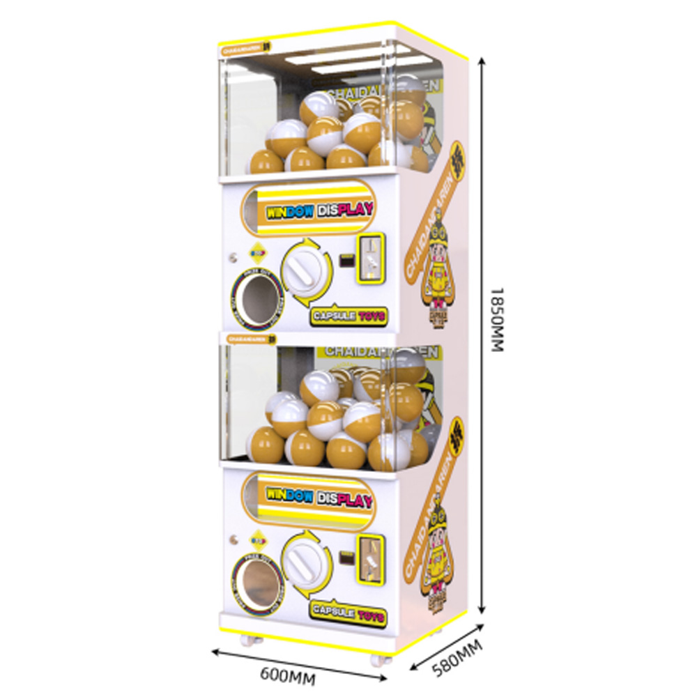 This double-layer gashapon machine is based on a square shape. While maintaining its square structure, it does not lack a rounded and playful touch. Complemented by light accents, the overall effect is concise and elegant yet fashionable, making it suitable for application in multiple scenarios and venues.